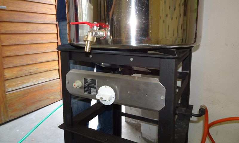 Nachdem unser erster Kocher kaputt gegangen ist, haben wir uns entschieden, beim zweiten Kocher eine Nummer größer zu wählen. Da es im Bereich Einkoch-/ Heißgetränkeautomaten kaum Kocher mit einem Fassungsvermögen über 30 l gibt, haben wir uns für einen 100 l Edelstahltopf entschieden. Dazu haben wir einen Auslasshahn gekauft und unten an den Topf montiert. Es würde sehr lange dauern, 60 l Wasser mit Strom zu erhitzen. Somit haben wir uns für einen Gas-Hockerkocher entschieden.